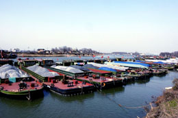 1月6日,在安徽裕溪口閘前的水道上,許多貨船?吭诎哆叺却^閘。近一兩個月以來,巢湖水域和長江安徽段降水較少,再加上連續干旱等原因,水位持續偏低,通過連接巢湖水域和長江的裕溪河航道的船只必須排隊逐一通過裕溪口閘。