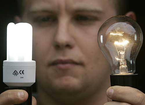 27日,在澳大利亞悉尼,電器推銷員戴夫·埃雷特手舉一只舊式白熾燈泡(右)和一只新型節(jié)能燈泡。根據(jù)澳大利亞政府2月20日公布的一項(xiàng)決定,由于新型節(jié)能燈可以節(jié)約更多資源并且減少溫室氣體排放量,它將逐步取代舊式白熾燈泡。