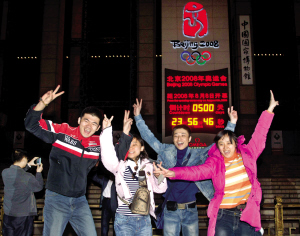 昨天(26日),幾名學(xué)生在中國(guó)國(guó)家博物館門前的2008年奧運(yùn)會(huì)倒計(jì)時(shí)牌前歡呼留影。當(dāng)晚,北京迎來(lái)2008年奧運(yùn)會(huì)倒計(jì)時(shí)500天。 在迎接奧運(yùn)會(huì)的日子中,北京以及奧運(yùn)會(huì)比賽協(xié)辦城市的每位民眾都對(duì)奧運(yùn)會(huì)有著自己的期待。
