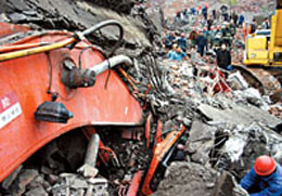 4月1日,救援人員正在現場施救。當日15時40分左右,在巢湖市居巢區銀屏鎮岱山窯廠一正在拆遷的六層立窯突然倒塌,將挖掘機埋住,駕駛員被卡在駕駛室里不幸身亡。事發后,巢湖市消防、公安等部門救援人員趕赴現場營救。