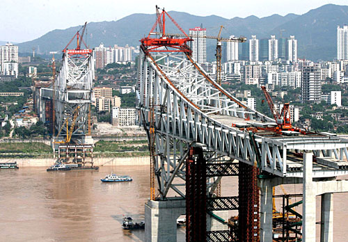 圖為建設中的重慶朝天門長江大橋(7月31日攝)。重慶朝天門長江大橋為公路軌道交通兩用鋼箱提籃拱特大橋。目前主體工程完成過半,建設進展順利,該大橋預計2008年內建成通車。