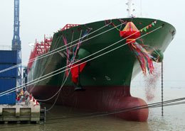 這艘名為“新亞洲”號的超大型集裝箱船船體總長335米,設置九個貨艙,總裝箱量達8530標準箱,載重量10.1萬噸,航速25節。它是目前中國自主設計建造完成的最大型集裝箱船。