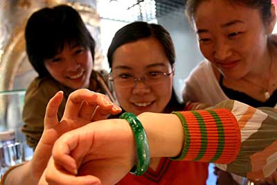 圖為消費者試戴一只價格昂貴的翡翠手鐲。日前,一家以零售為主、同時兼營珠寶租賃業務的珠寶店在北京市朝陽區開業。據介紹,珠寶租賃業務主要針對10萬元以上的高檔產品,顧客可以花較少的錢租用到價值昂貴的豪華珠寶首飾。