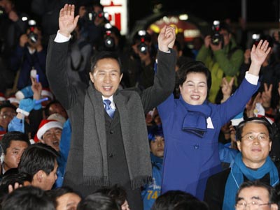 19日,在韓國首都首爾的大國家黨總部,大國家黨總統候選人李明博(左)與夫人和支持者們慶祝總統選舉獲勝。韓國中央選舉管理委員會19日晚宣布,李明博當選韓國新一任總統。