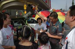 5月31日,人們在臺州的“汽車后備箱市場”選購物品。當日,浙江臺州的200多輛私家車聚集在當地一處廣場參加“汽車后備箱市場”活動。車主們以后備箱為“攤位”,擺放汽車配飾、生活用品等供人選購。全部義賣所得和其他募集的善款將捐獻地震災區,用于援建一所愛心學校。