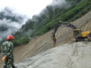 9月16日,武警官兵在搶險(xiǎn)。當(dāng)日,川藏公路因泥石流和山體滑坡造成交通中斷。由于近期連續(xù)降雨,川藏公路波密縣境內(nèi)的“102滑坡群”發(fā)生大型泥石流,并造成山體垮塌,覆蓋路面100多米。保守估計(jì)需三天時(shí)間才能搶通。