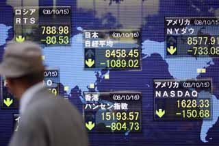 10月16日,行人從日本東京一塊日經(jīng)股指顯示板前走過。受歐美股市大跌和投資者擔(dān)心世界經(jīng)濟(jì)形勢惡化等因素影響,當(dāng)天東京股市日經(jīng)225種股票平均價格指數(shù)比前一個交易日下跌1089.02點,收于8458.45點,跌幅為11.41%。