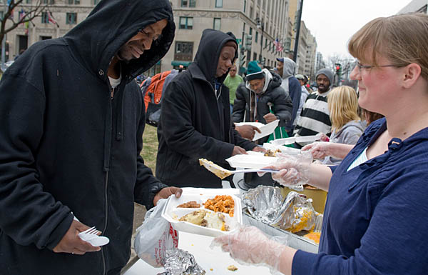3月7日,在美國華盛頓,志愿者向無家可歸者分發(fā)食物。美國勞工部6日公布的數(shù)據(jù)顯示,今年2月份美國非農(nóng)業(yè)部門就業(yè)崗位減少65.1萬個(gè),失業(yè)率上升至8.1%,為1983年年底以來的最高水平。新華社/法新
