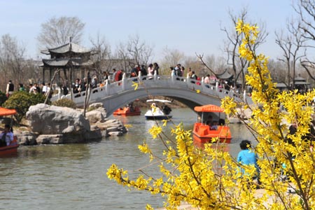4月6日,在天津長虹公園,小橋流水的美景吸引了眾多游人。當(dāng)日,天津最高氣溫達26攝氏度,市民紛紛來到戶外享受春色。新華社記者:馬平 攝