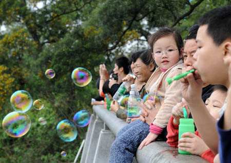 4月6日,市民們在白云山頂?shù)挠^景臺上觀賞游玩。4月4日到6日,廣州的許多市民來到白云山、云臺花園等風(fēng)景秀麗、空氣清新的郊外去野營、遠足和踏青,以此方式來度過三天長假。新華社記者:周文杰