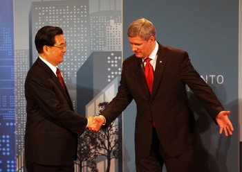 6月26日,中國國家主席胡錦濤在多倫多出席加拿大總理斯蒂芬·哈珀舉行的二十國集團領導人工作晚宴。 這是斯蒂芬·哈珀在多倫多皇家約克飯店迎接胡錦濤。新華社記者