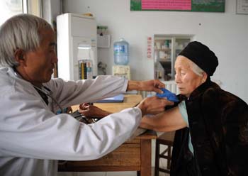 11月29日,一名山東省鄒平縣廉家村農民在衛生室體檢時檢測血壓。2010年11月開始,山東省鄒平縣為全縣62萬農民進行當年的第二次體檢工作全面展開。記者 徐速繪/攝 |