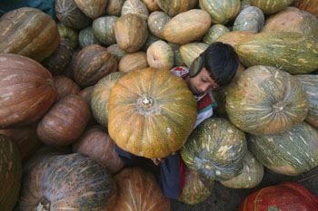 2010年12月3日,一名男孩在印度北部城市昌迪加爾的一家蔬菜批發(fā)市場內(nèi)搬運南瓜。2010年新興和發(fā)展中經(jīng)濟體的經(jīng)濟復(fù)蘇步伐明顯快于發(fā)達(dá)經(jīng)濟體,特別是以“金磚四國”——中國、印度、巴西、俄羅斯為代表的新興經(jīng)濟體的國內(nèi)生產(chǎn)總值增長率遠(yuǎn)高于美、日、英和歐元區(qū)內(nèi)的發(fā)達(dá)經(jīng)濟體,成為推動世界經(jīng)濟復(fù)蘇與增長的重要力量。新華社發(fā) |
