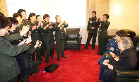 3月7日,解放軍女代表、女委員互相拍照留念。當日,在北京參加兩會的解放軍女代表、女委員歡聚京西賓館,慶祝“三八”國際勞動婦女節。