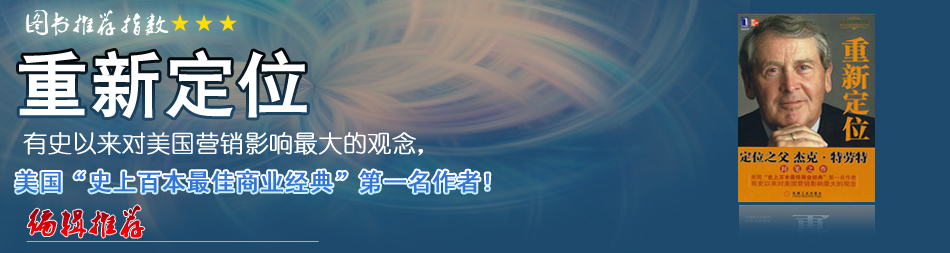 《重新定位》是特勞特先生40年商業經驗的結晶,是對定位理論的完善和創新。作為打造品牌的重要理論,此書的出版正逢中國企業亟須品牌的時候,對中國企業而言可謂及時雨。而中國巨大的市場潛力,也正好可以讓“重新定位”實現其意義,因為無論是“定位”還是“重新定位”,都需要踐行才能體現價值…[詳細]