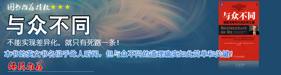 在這個極度競爭的世界中,在全球經濟深刻劇變的年代中,誰敢保證自己的企業能生存下來,甚至活得更好?本書的英文書名似乎聳人聽聞,但與眾不同的道理確實如此簡單和關鍵。本書將幫助困境中的企業,通過許多生動的故事,包括來自中國的案例,講解實施差異化的方法。用特勞特先生對中國企業的話來講:如果你的產品是差異化的,整個世界就會為你敞開大門。