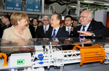 2月3日,正在廣東考察的國務院總理溫家寶與德國總理默克爾在廣州參觀海瑞克(廣州)隧道設備有限公司。記者 姚大偉 攝 |