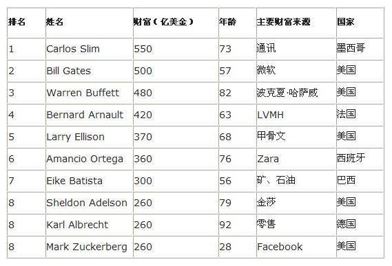 胡潤研究院今日發布2012年全球富豪榜,北美擁有全世界最多的百億美金富豪,墨西哥富豪卡洛斯斯利姆以550億美元成為全球首富。比爾蓋茨以500億美元的財富排名第二,股神巴菲特480億美元排名第三。