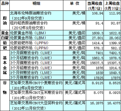 黃金市場方面,近幾周一直在1600美元上下震蕩。由于中國7月份進出口增速放緩,加劇市場投資者對新一輪量化寬松貨幣政策的預期,紐約黃金期貨合約價格10日繼續上行,小幅收高。