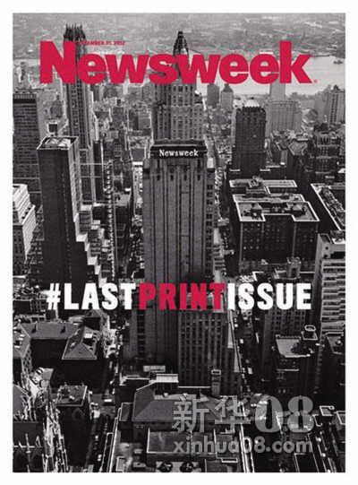 美國知名雜志《新聞周刊》最后一期印刷版將于12月31日在各報(bào)刊亭正式銷售。當(dāng)?shù)貢r間12月23日,該雜志網(wǎng)站發(fā)布了最后一期印刷版封面——一張?jiān)撾s志位于美國紐約市辦公大樓的黑白照片,照片上方為該刊發(fā)行日期(2012年12月31日),中下部則配以“最后一期印刷版”的字樣,充滿了離愁別緒。而在“最后一期印刷版”字樣的前面使用了“#”字標(biāo)簽。這不僅意味著《新聞周刊》以詩化的方式向社交媒體致意,且表明社交媒體是導(dǎo)致該雜志紙質(zhì)刊物走到盡頭的原因之一。