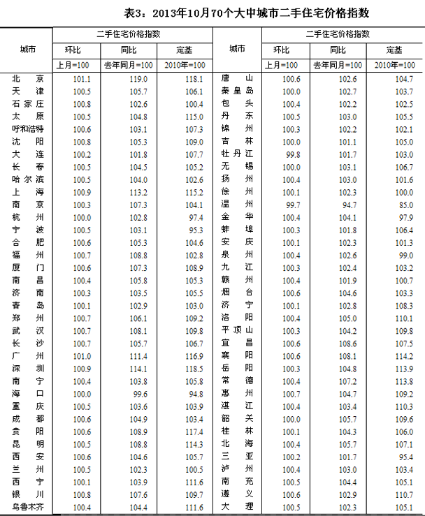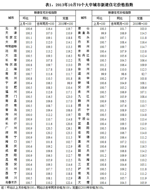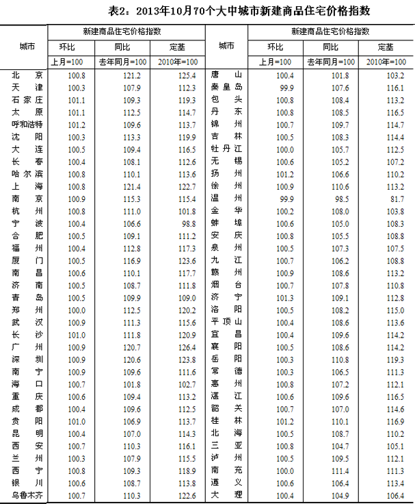 國家統計局18日發布2013年10月份70個大中城市住宅銷售價格變動情況顯示,與上月相比,70個大中城市中,新建商品住宅(不含保障性住房)價格下降的城市有2個,持平的城市有3個,上漲的城市有65個。環比價格變動中,最高漲幅為1.3%,最低為下降0.1%。