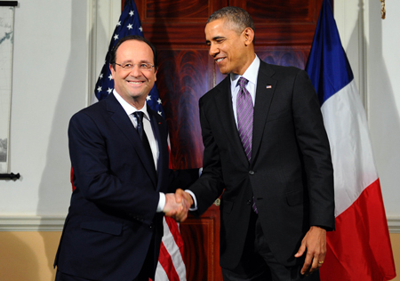 法國總統(tǒng)奧朗德10日開始對(duì)美國進(jìn)行為期三天的國事訪問,希望加強(qiáng)兩國的商業(yè)合作,提振法國經(jīng)濟(jì)。美國總統(tǒng)奧巴馬和奧朗德10日聯(lián)合撰文強(qiáng)調(diào),美法兩國正在深化經(jīng)濟(jì)關(guān)系,美國和歐盟正在進(jìn)行的"跨大西洋貿(mào)易和投資伙伴關(guān)系協(xié)定"談判,將促進(jìn)雙邊貿(mào)易、就業(yè)和出口。圖為當(dāng)日奧巴馬(右)與奧朗德在參觀美國弗吉尼亞州夏洛茨維爾的美國第三任總統(tǒng)托馬斯·杰斐遜故居后握手。