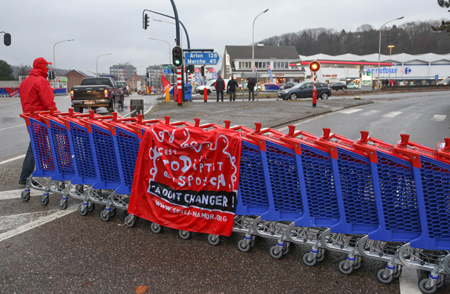 比利時各行業15日響應三大工會號召舉行全國大罷工,導致公共交通完全癱瘓,商店幾乎全部關門。包括比利時勞動聯合總會在內的比利時三大工會10月15日發布聯合公告稱,將于12月15日組織全國大罷工,抗議新的聯邦政府制定的財政緊縮等經濟措施。 圖為當日在比利時讓布,一名男子經過一條由超市手推車構建的路障。
