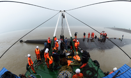 6月2日,救援人員在沉船現(xiàn)場對“東方之星”輪展開營救。 6月1日晚,從南京駛往重慶的客船“東方之星”輪在長江中游湖北監(jiān)利水域發(fā)生翻沉。據(jù)初步統(tǒng)計,事發(fā)客船共有458人,其中旅客406人。