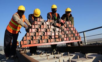 7月22日,中鐵九局鐵路建設者在額哈鐵路建設工地搬運托軌滑輪。額哈鐵路是國家“一帶一路”戰略和《中長期鐵路規劃網》重點工程,預計年底建成投入運營。 新華社發(蔡增樂攝) |
