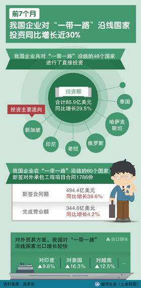 前七個月,我國企業(yè)共對“一帶一路”沿線的48個國家進行了直接投資,投資額合計85.9億美元,同比增長29.5%,投資主要流向新加坡、印尼、老撾、俄羅斯、哈薩克斯坦、泰國等。