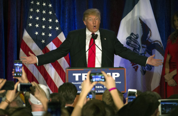 2月1日,美國共和黨總統候選人唐納德·特朗普在美國艾奧瓦州錫達拉皮茲參加競選活動。美國中西部的艾奧瓦州1日晚舉行2016年總統選舉首場黨內預選,打響今年美國總統大選的第一槍。 新華社/歐新中文? |