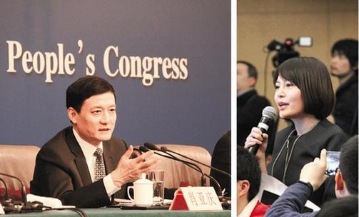 3月12日,十二屆全國人大四次會議新聞中心舉行記者會。國資委主任肖亞慶(左圖)在回答《經濟參考報》記者楊燁(右圖)提問時表示,去年央企整體利潤為6.9%的負增長。在經濟下行壓力下,今年以來,央企將壓力轉化為動力,1至2月份,央企利潤增長了4.7%。他說,央企今年的情況相對穩(wěn)定,各個央企在穩(wěn)增長和提效益方面也做了大量工作。不過,從部分行業(yè)目前所處的狀況來看,恐慌心理比下行壓力更可怕,并有可能帶來更大的下行。我國市場很大,關鍵是從央企開始,振奮精神,真抓實干,要把產品質量提高,把成本降下來。????本報記者 張莫 攝