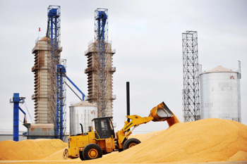 在黑龍江省富錦市一糧食收儲(chǔ)企業(yè)大院內(nèi),鏟車在翻運(yùn)糧食。 新華社記者 王建威/攝? |