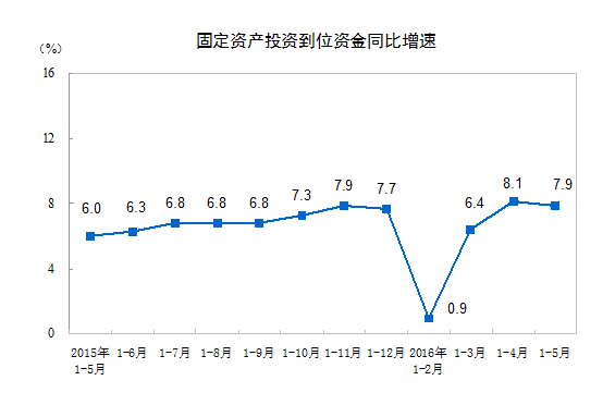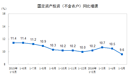 ? 2016年1-5月份,全國固定資產投資(不含農戶)187671億元,同比名義增長9.6%,增速比1-4月份回落0.9個百分點。從環比速度看,5月份固定資產投資(不含農戶)增長0.49%。