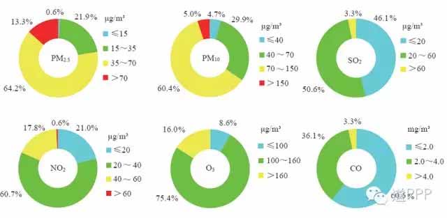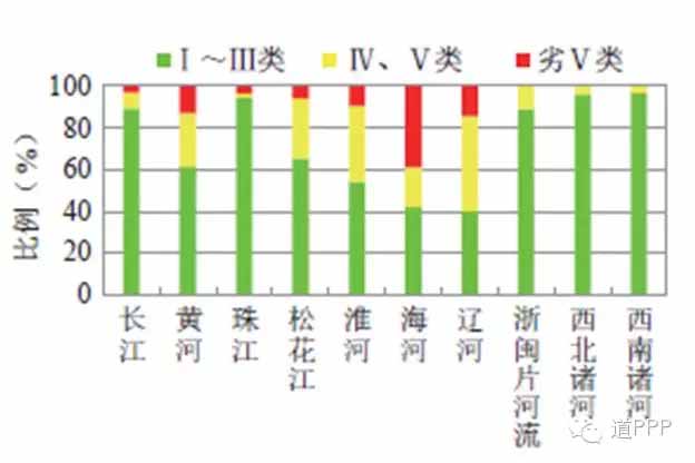 依照環保部根據《地表水環境質量標準》(GB3838-2002)所做的統計:2015年,長江、黃河、珠江、松花江、淮河、海河、遼河等七大流域和浙閩片河流、西北諸河、西南諸河的700個國控斷面中,Ⅰ類水質斷面占2.7%,比2014年下降0.1個百分點;Ⅱ類占38.1%,比2014年上升1.2個百分點;Ⅲ類占31.3%,比2014年下降0.2個百分點;Ⅳ類占14.3%,比2014年下降0.7個百分點;Ⅴ類占4.7%,比2014年下降0.1個百分點;劣Ⅴ類占8.9%,主要集中在海河、淮河、遼河和黃河流域,比2014年下降0.1個百分點。各流域水質狀況統計如圖3所示。目前污水處理項目是環保類PPP項目中占比較多的,在未來可以獲得更詳盡數據的基礎上,這些污水處理PPP項目與區域水污染情況的精確匹配和相應截污模式的設計也是我們在后續需要重點研究的。