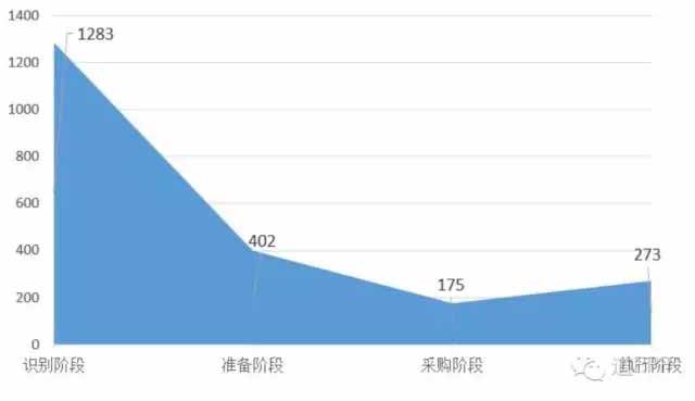 按全國PPP綜合信息平臺項目庫的劃分,PPP項目可分為識別、準備、采購、執行與移交五個階段。目前環保項目中尚未有項目進入移交階段,處于識別階段的項目最多,數量高達1283個。與其他領域PPP項目不同的是,該領域執行階段的項目數量超過了采購階段項目,說明環保類PPP項目落地相對較快。各階段項目數量分布情況如圖12所示。
