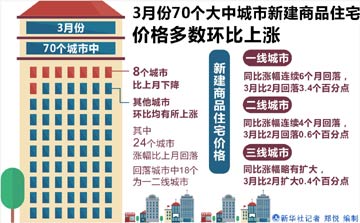 劉建偉說,初步測算,一線城市新建商品住宅價格同比漲幅連續六個月回落,3月比2月回落3.4個百分點;二線城市新建商品住宅價格同比漲幅連續四個月回落,3月比2月回落0.6個百分點;三線城市新建商品住宅價格同比漲幅略有擴大,3月比2月擴大0.4個百分點。