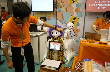 ??? 11月21日,在日本東京舉行的2017軟銀機器人世界大會上,一名工作人員為人型機器人Pepper戴上假發。當日,為期兩天的2017軟銀機器人世界大會在東京開幕。新華社/歐新 |