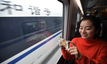 ??? 11月22日,參加模擬運行的體驗人員在列車上拍照。當日,西成高鐵進入全線拉通試驗階段。西成高鐵是我國首條穿越秦嶺的高速鐵路,設計速度為每小時250公里。記者 薛玉斌 攝 |