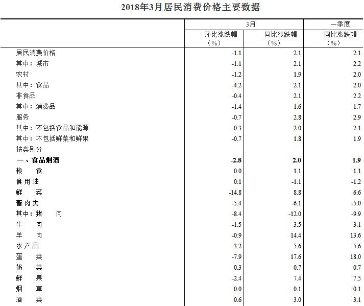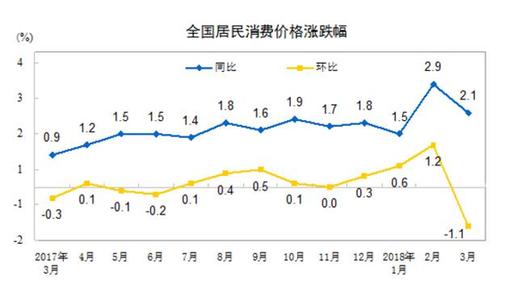 4月11日,國家統計局發布統計數據,2018年3月份,全國居民消費價格同比上漲2.1%。其中,城市上漲2.1%,農村上漲1.9%;食品價格上漲2.1%,非食品價格上漲2.1%;消費品價格上漲1.6%,服務價格上漲2.8%。一季度,全國居民消費價格總水平比去年同期上漲2.1%。