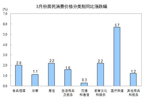 其他七大類價格同比均上漲。其中,醫療保健、居住、教育文化和娛樂價格分別上漲5.7%、2.2%和2.2%,生活用品及服務、其他用品和服務價格分別上漲1.6%和1.2%,衣著、交通和通信價格分別上漲1.1%和0.3%。