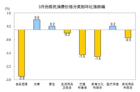 3月份,全國居民消費價格環比下降1.1%。其中,城市下降1.1%,農村下降1.2%;食品價格下降4.2%,非食品價格下降0.4%;消費品價格下降1.4%,服務價格下降0.7%。