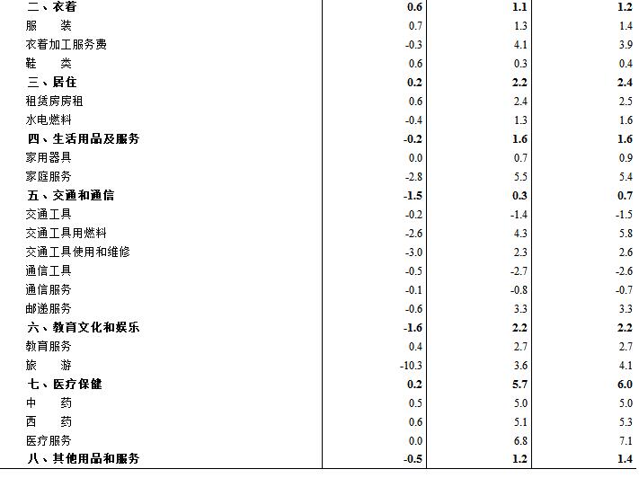 其他七大類價格環比三漲四降。其中,衣著、居住、醫療保健價格分別上漲0.6%、0.2%和0.2%;教育文化和娛樂、交通和通信價格分別下降1.6%和1.5%,其他用品和服務、生活用品及服務價格分別下降0.5%和0.2%。