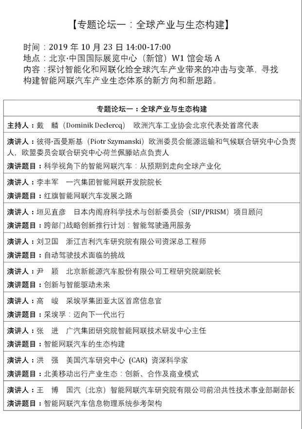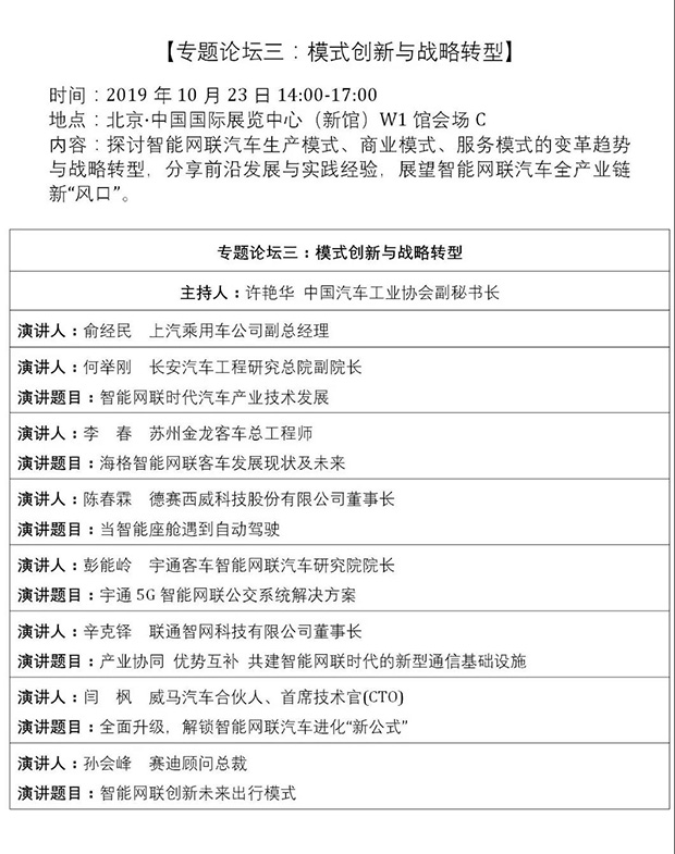經國務院批準,世界智能網聯汽車大會(WICV) 將于2019年10月22-25日在北京隆重召開。大會著眼于全球智能網聯汽車產業的生態環境構建和產業升級,通過主論壇及專題論壇、院士講堂、開發者大會、閉門會等多種形式,共同交流探討智能網聯汽車在技術創新、政策導向、市場模式等領域的成功經驗與發展趨勢,凝聚產業共識,明晰政策方向,探索技術路徑。 主辦單位:北京市人民政府、工業和信息化部、公安部、交通運輸部、中國科學技術協會 承辦單位:工業和信息化部裝備工業發展中心、北京市經濟和信息化局、中國電子信息產業發展研究院、北京市順義區人民政府、中國國際貿易促進委員會機械行業分會、中國電工技術學會 時間:2019年10月22日-25日 |