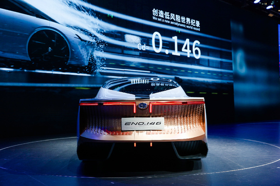 ENO.146概念車是廣汽集團打造的6座大型電動乘用車,通過完全流線型的車身造型、車身側面完全平面的輪轂設計,以及車窗下沿的導流槽,ENO.146概念車實現了超低風阻系數,風阻系數僅有0.146,創下了全球低風阻新紀錄,體現了廣汽研究院在空氣流場管理與風阻降低技術的先進性。