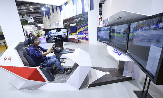 11月5日,工作人員在演示紅旗汽車與諾基亞公司聯合開發的5G遠程駕駛技術。當日,第二屆中國國際進口博覽會在國家會展中心(上海)開幕。記者 王鵬 攝