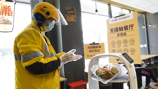 美團外賣騎手到無接觸餐廳示范店取餐。資料照片