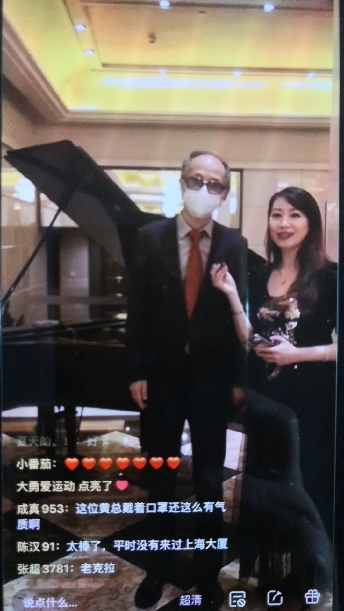 上海大廈負責人(左)介紹與飯店同齡的鋼琴