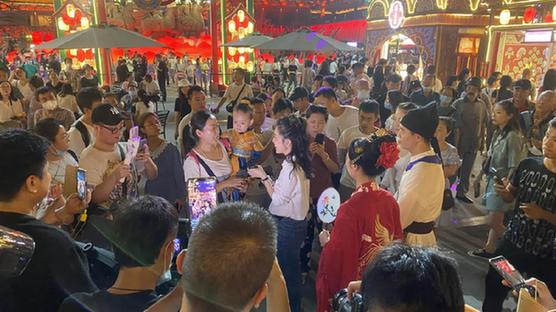 直播當日,在如畫卷般的長安夜色中,主持人和大唐不夜城“唐妞”、曲江文旅“李白”一起漫步大唐不夜城,探訪“盛世長安”的人間煙火。在“唐食坊”內,主持人和嘉賓走街串店,品嘗了團扇酥、杏酪酥、貴妃稠酒、長安冰酪等原汁原味的唐朝美食,還為大家介紹了唐代的禮儀與風俗。文創產品“長安冰酪”的亮相引發網友熱議,“大雁塔”和“唐仕女”造型的創意冰激凌,由身穿古代服飾的“店小二”遞到手里,瞬間就有了穿越唐朝的感覺。除了美食之外,在大唐不夜城街區上還有“真人不倒翁”“武士雕刻”“懸浮李白”等藝術表演。歷史和現代交相呼應,文化和潮流完美碰撞,讓大家宛如踏入盛唐繁華的都市勝景。