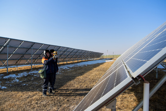 1月20日,在位于烏蘭察布市察哈爾右翼中旗的中廣核新能源浩普光伏電站,工作人員在巡查光伏板。